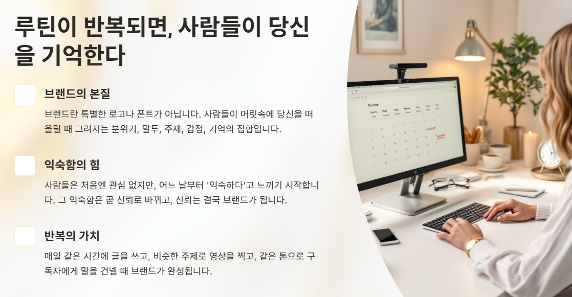 루틴을 반복하면 사람들이 기억하게 된다. 루틴 기반 콘텐츠가 어떻게 브랜드가 되고, 팬을 만들며, 자산이 되는지 브랜딩 루틴 전략으로 설명합니다