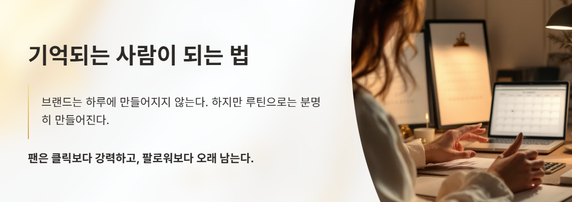 이 글에서는 ‘루틴이 어떻게 개인 브랜드가 되고, 그 브랜드가 어떻게 팬을 만들고, 결국 콘텐츠가 자산이 되는가’를 구체적으로 알려준다.